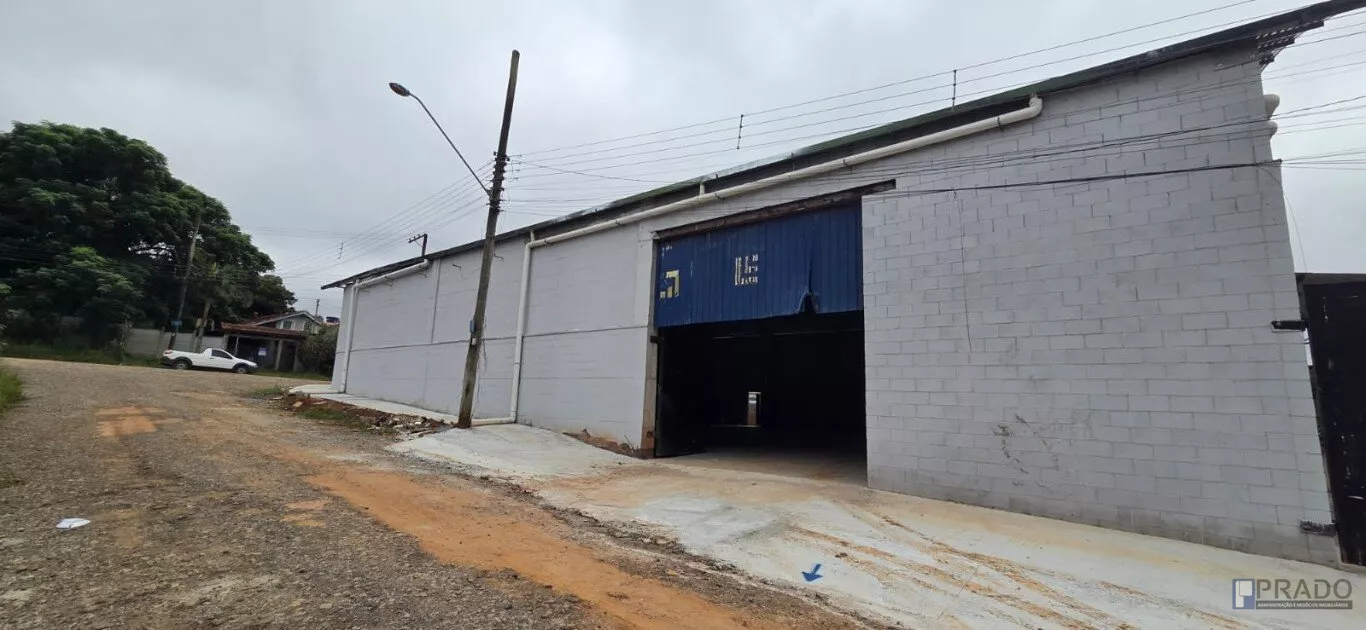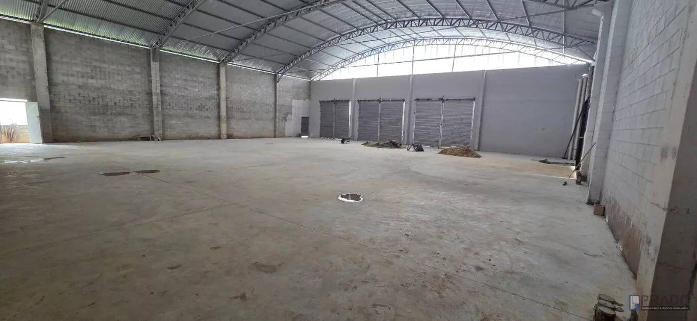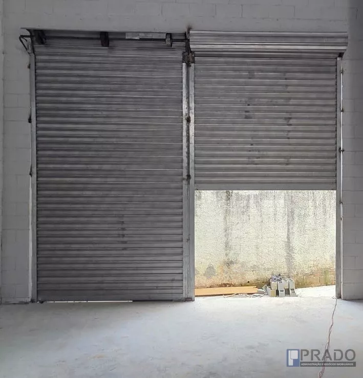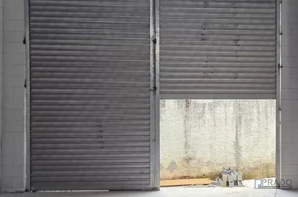Portão grande para entrada de veículos dentro do galpão.